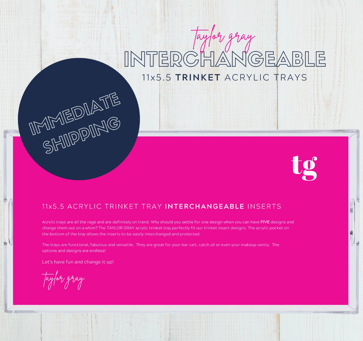 This listing is for a blank trinket tray with the protective pocket to slide in your insert sets. **The TAYLOR GRAY acrylic TRINKET TRAY is a 11x5.5 tray that perfectly fit our TRINKET insert designs. The patent pending pocket on the bottom of the tray allows the inserts to be easily interchanged and protected. Acrylic trays are all the rage and are definitely on trend. Why should you settle for one design when you can have FIVE designs and change them out on a whim?