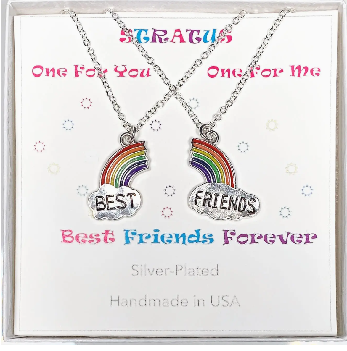 2 each 16 inch silver-plated necklaces with enamel colorful rainbow & cloud charms. The closures are a lobster clasp. They are packaged together in a gift box. The charms are approximately 3/4 inch by 7/8 inch.