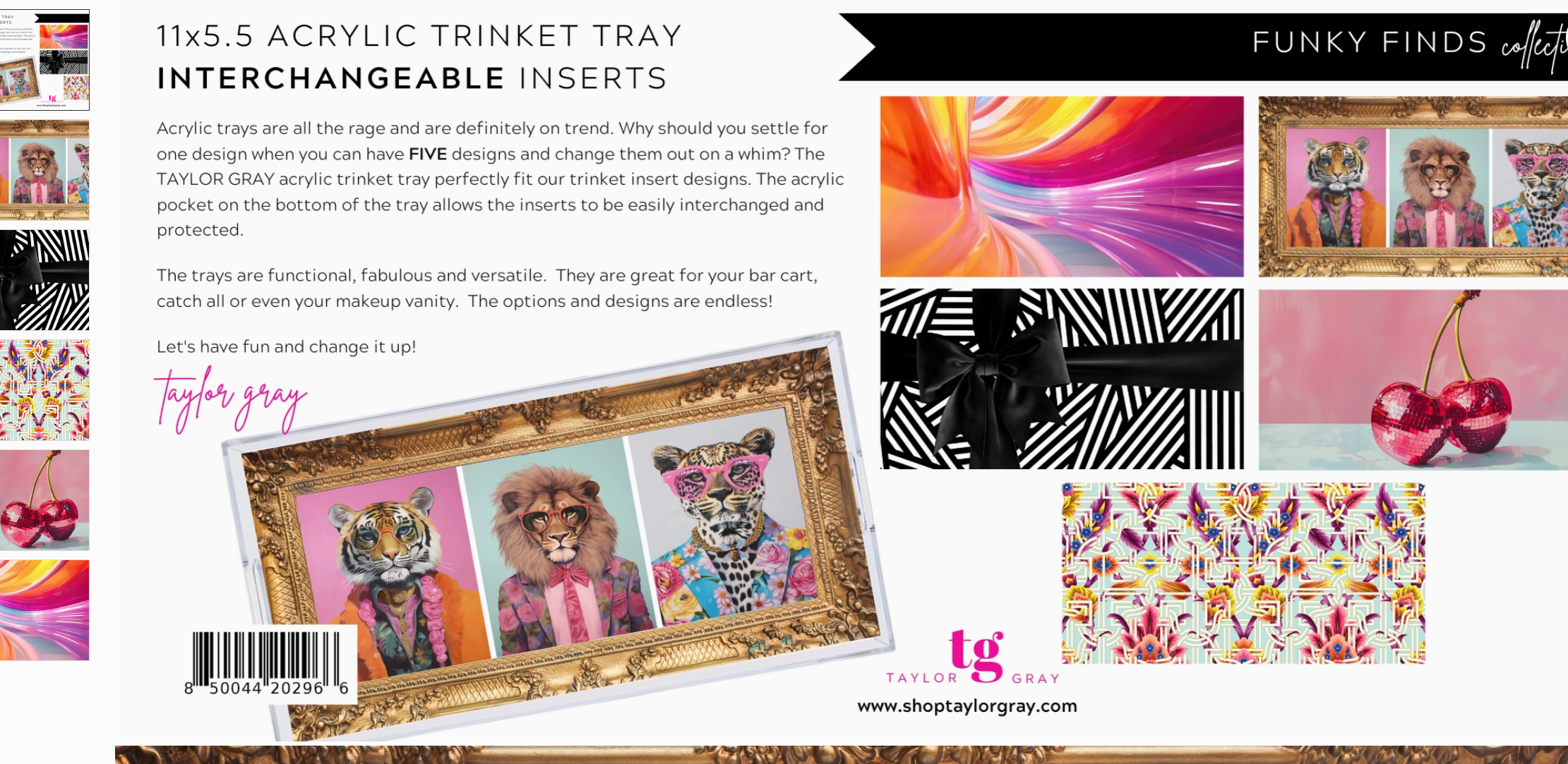 Embrace your funky side and enjoy an eclectic mix of animals, patterns, disco cherries and more. Great for dorm room decor! **The TAYLOR GRAY acrylic TRINKET TRAY is a 11x5.5 tray that perfectly fit our TRINKET insert designs. The patent pending pocket on the bottom of the tray allows the inserts to be easily interchanged and protected. Acrylic trays are all the rage and are definitely on trend. Why should you settle for one design when you can have FIVE designs and change them out on a whim? The trays are functional, fabulous and super cute. They are great for your bar cart, makeup counter or even for a catch all. The options and designs are endless!