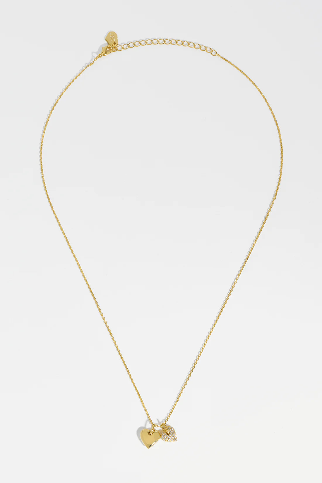 Elevate your look with our Pave Double Heart Charm Necklace. Featuring a pillowy plain gold plated heart with a slightly smaller pave heart charm.