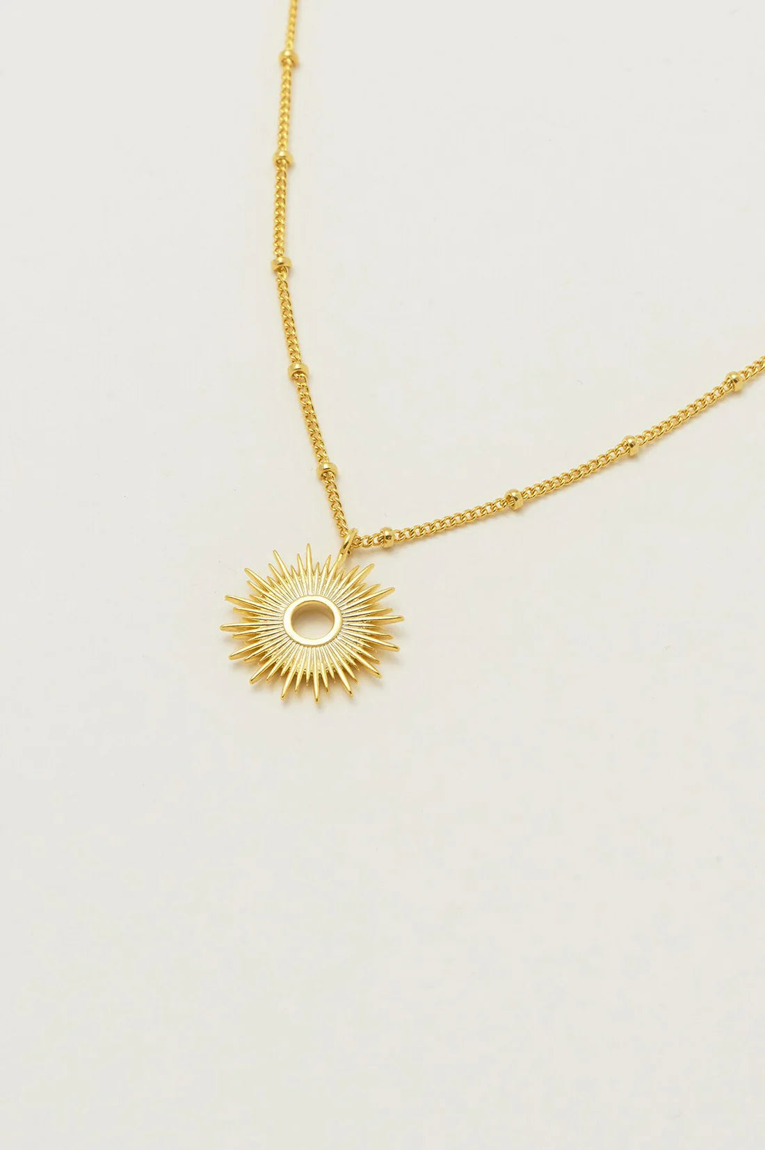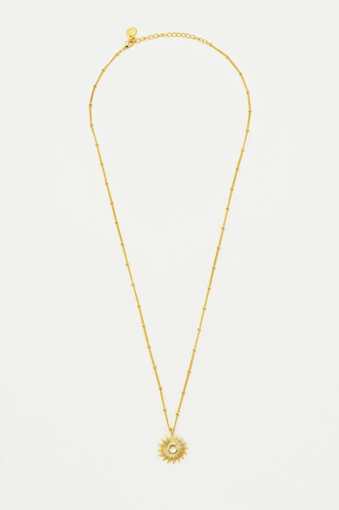 Radiate and wear a burst of sunshine with our radial sunburst necklace. Inspired by the motifs and forms of Art Deco, this necklace will become your new everyday classic. The longer beaded chain makes this a perfect piece for wearing solo or layering up with your other favorite pendants.