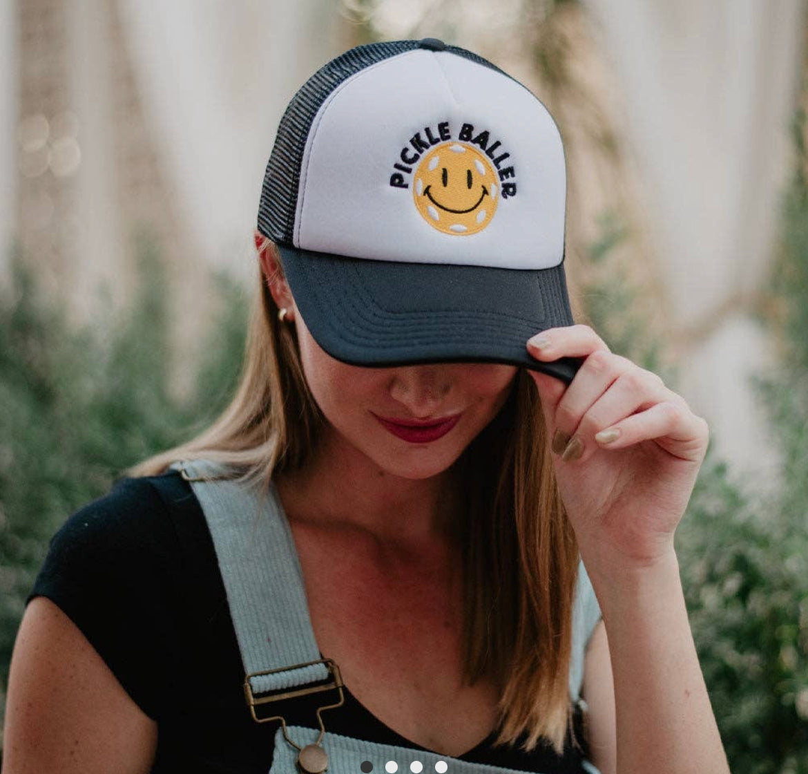 Looking for a fun and girly way to show your love for pickle ball? Look no further than this adorable Pickle Baller Trucker Hat! This foam trucker hat is sure to make you stand out on the court, and the snap adjustment means it will always fit just right. Plus, who can resist that cute pickle ball and smiley face design? 65% cotton, 35% polyester machine wash delicate or hand wash one size fits most adjustable back mesh netting snapback closure