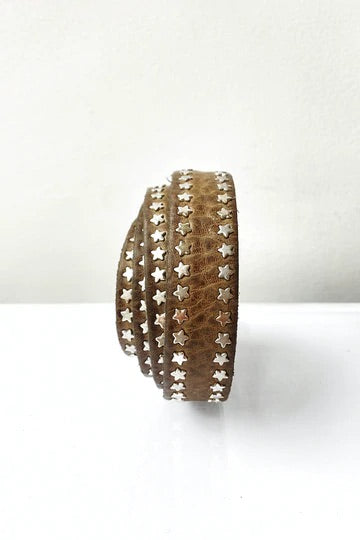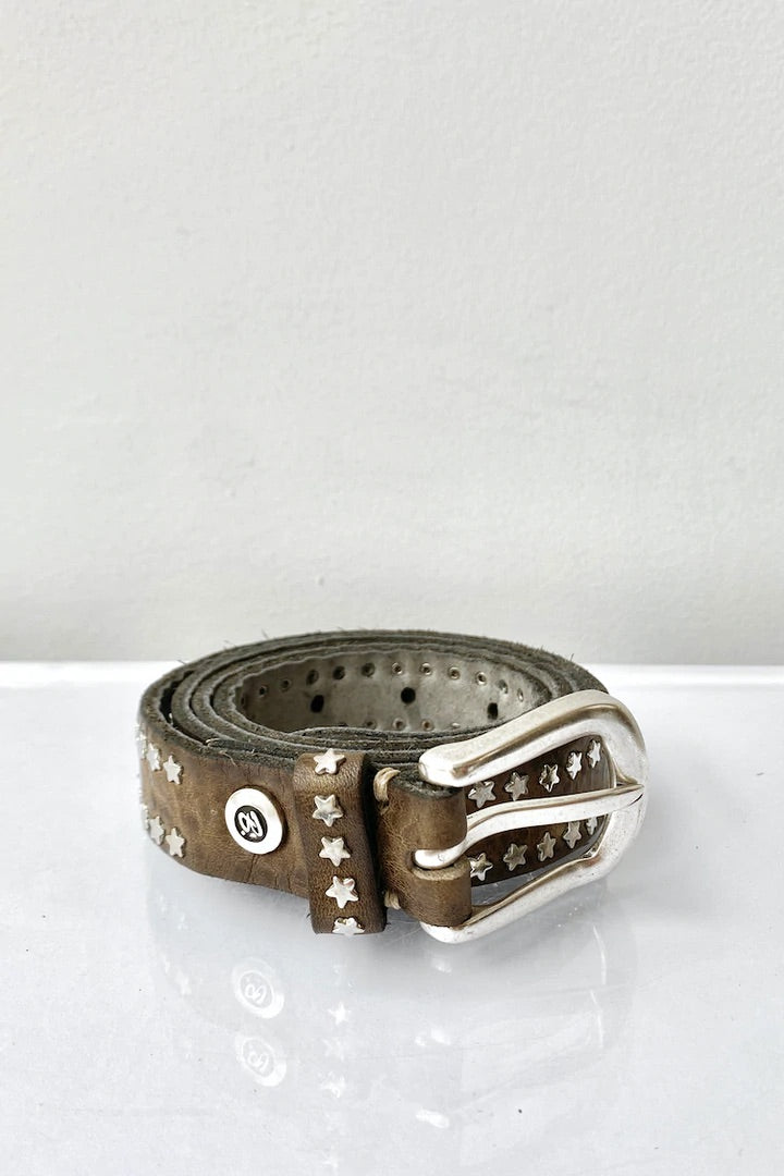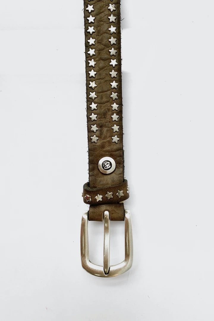 This fullgrain leather belt has stars rivets and a buckle in silver.