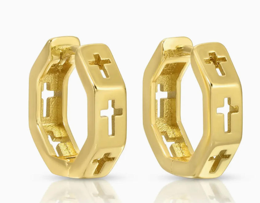 Make a subtle statement with these unassuming cross huggies, featuring an octagon shape adorned with tiny cross cut-outs. .5" Drop 18k Gold or Rhodium Plated Brass Base