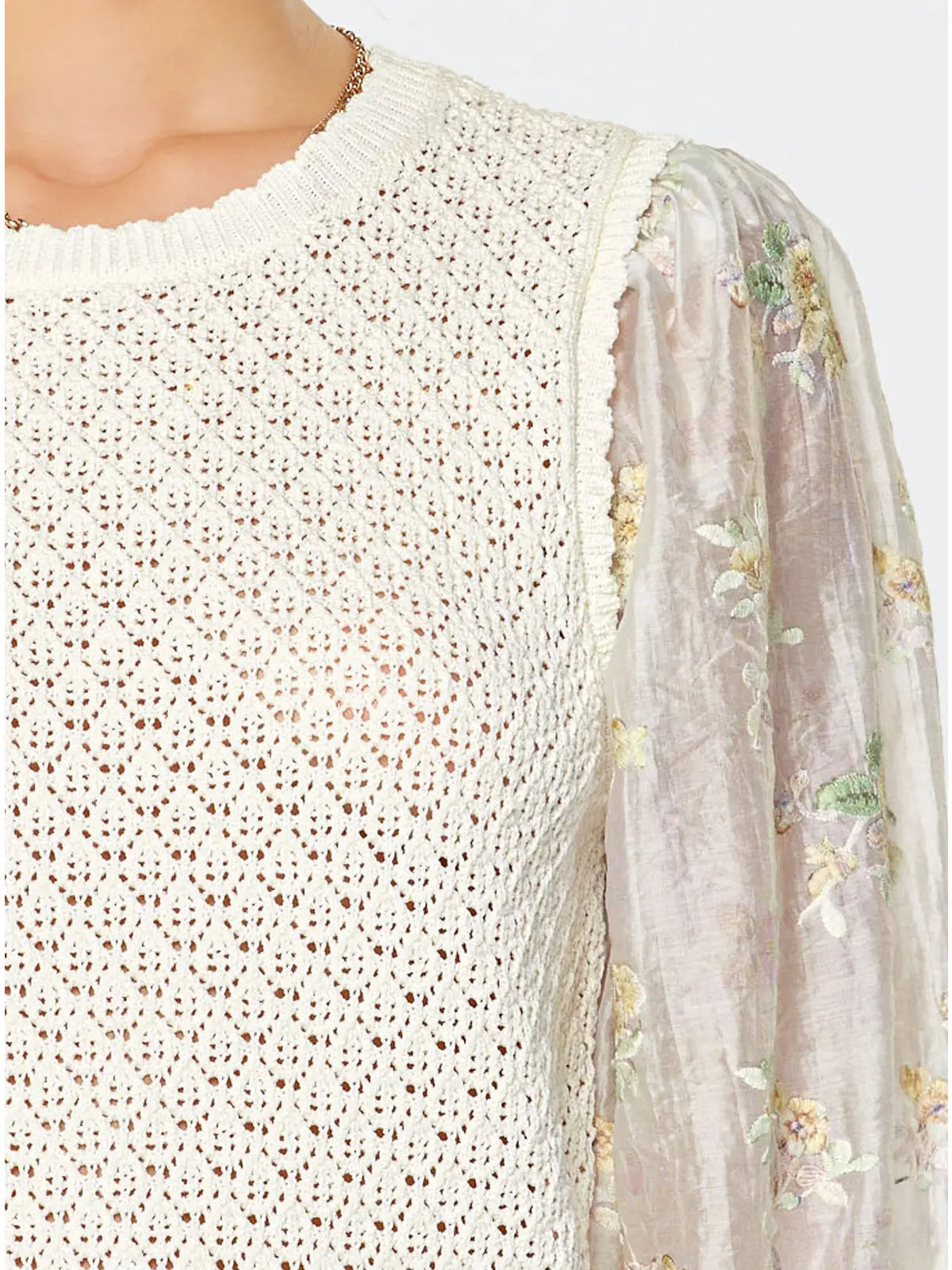 -Scalloped crew neck crochet knit sweater -Sheer organza sleeves with floral embroidery -3/4 length puff sleeves with ruffle cuffs -Open knit textured -Ribbed neckline, hem, and cuffs -Regular fit silhouette -Hand wash cold separately, lay flat to dry