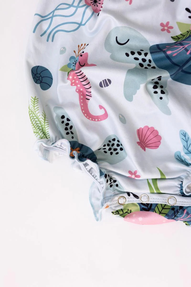 Our Strappy Dress is perfect for summer! Straps criss cross in the back and are finished off with a sweet ruffle on the shoulder. Snaps for easy diaper changes.