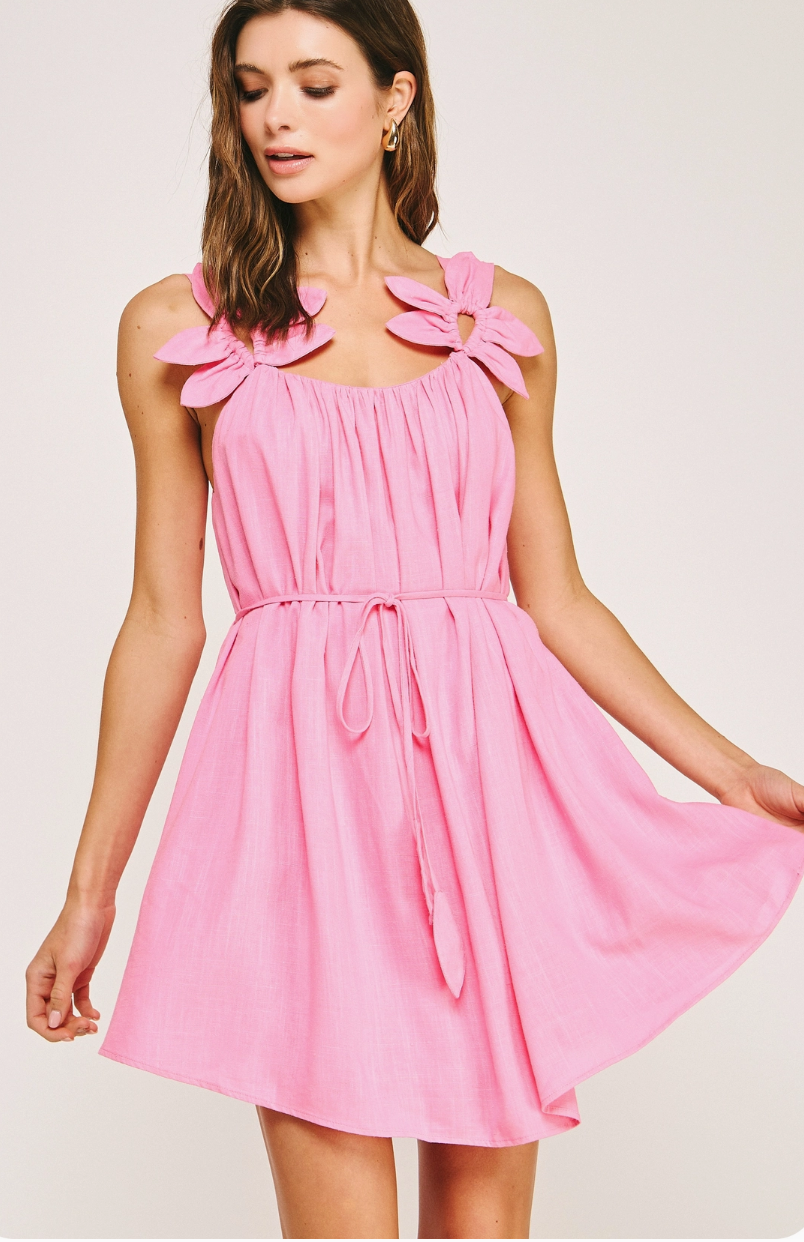 Flower petal detail mini dress in Viscose Linen blend fabric. This sleeveless dress features a breezy shift silhouette, a scoop neckline with shirring detail, flower petal appliqués at shoulder strap, side pockets, lining, and a removable sash belt with petal detail.