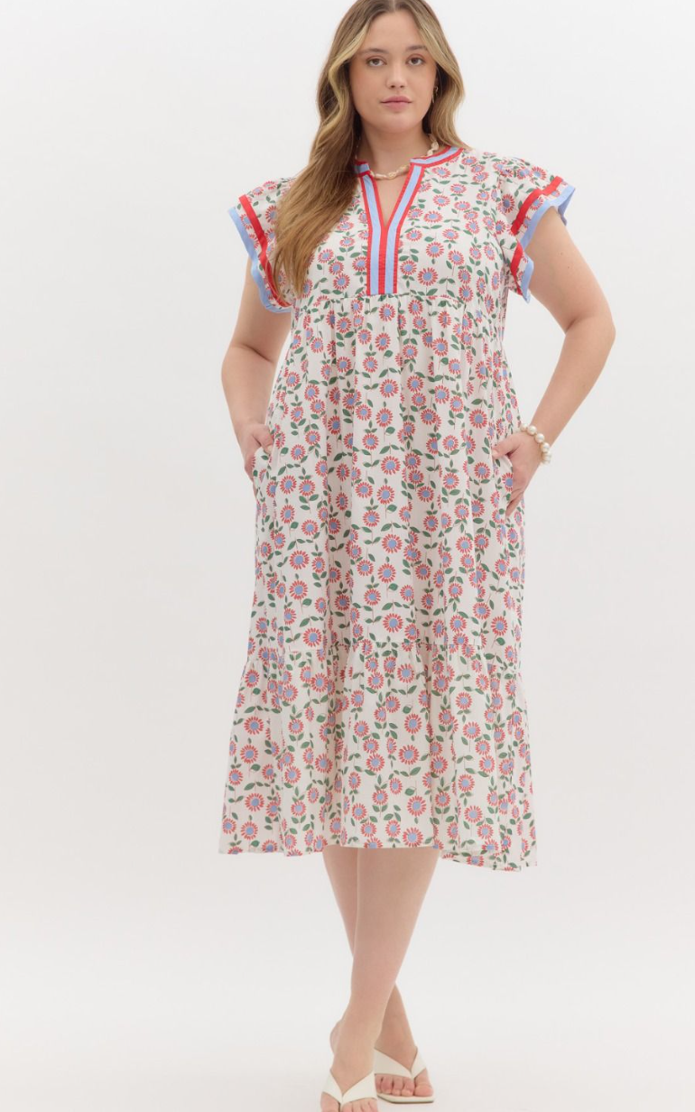 Floral print multicolor accented V-neck band pullover midi dress. Flutter sleeve featuring contrast accented binding finish. Pockets at sides. Lined. Woven. Non-sheer. Lightweight.