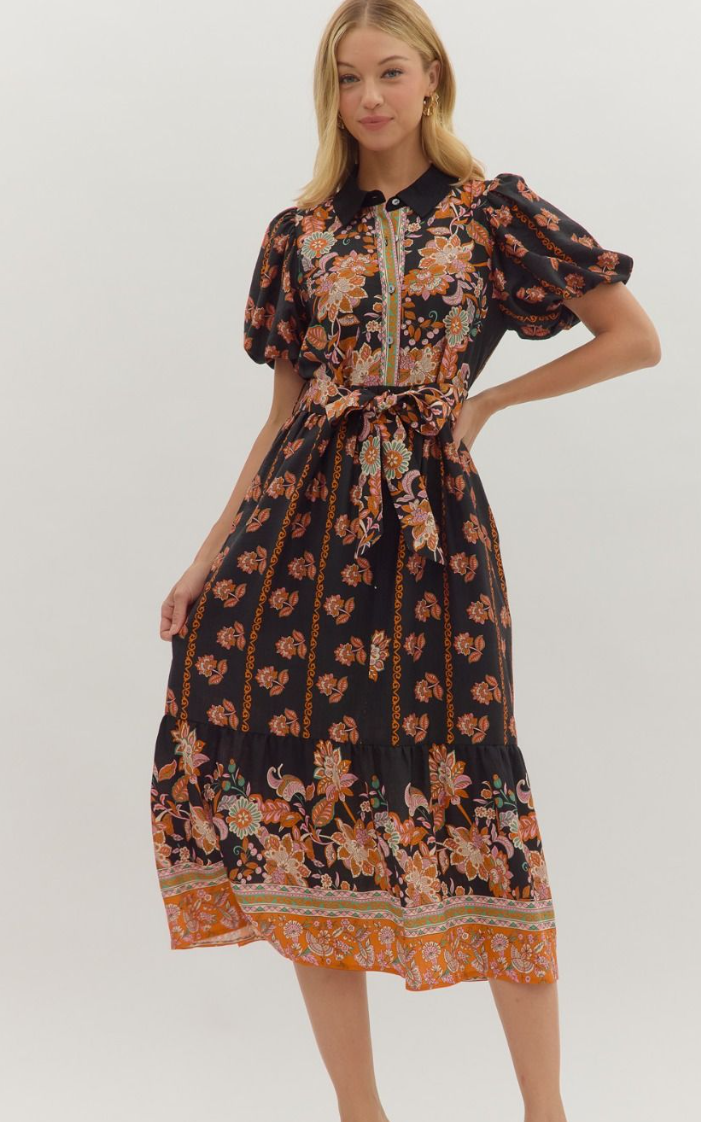 Botanical print short puff sleeve midi dress featuring contrast trim front button closure, shirt collar, pleated bodice, elasticated at waist with adjustable tie. Side pockets. Lined. Woven. Non-sheer. Lightweight.