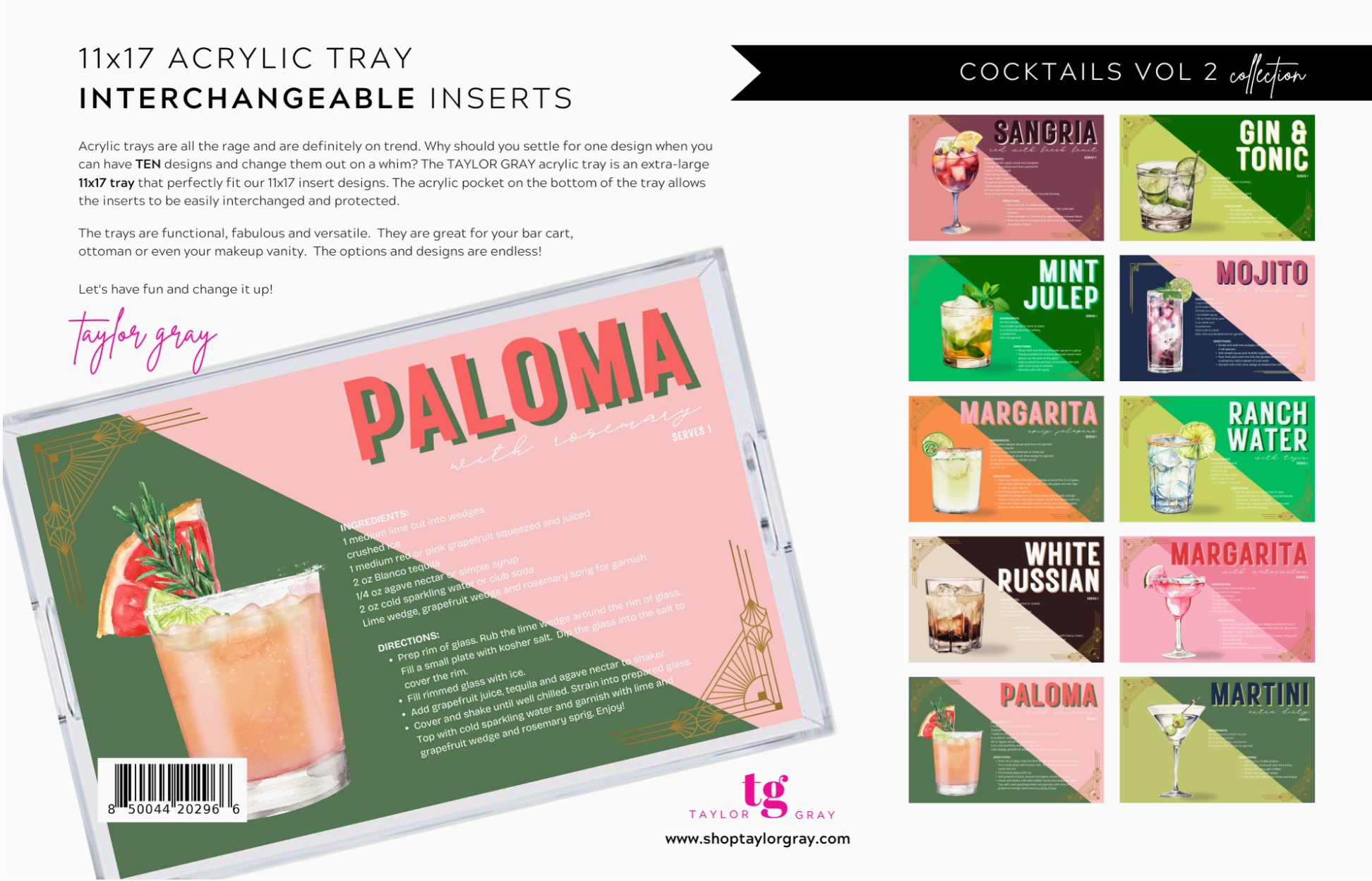 Take me to your bar cart! The cocktails insert set is a fun way to add modern color and design along with functionality with actual recipes. Fun for any space in your house. The prints are great to frame and create a gallery wall in your bar also. **Acrylic trays are all the rage and are definitely on trend. Why should customers settle for one design when they can have TEN designs and change them out on a whim? The TAYLOR GRAY acrylic tray is an extra-large 11x17 tray that perfectly fit our 11x17 insert designs. The patent pending pocket on the bottom of the tray allows the inserts to be easily interchanged and protected. The acrylic is also food safe. The trays are functional, fabulous and extra-large. They are great for your bar cart, ottoman or even for makeup on your vanity. The options and designs are endless!