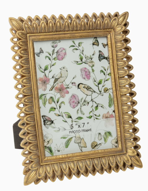 Antique gold pierced feather pattern resin frame, holds 5x7 in photo