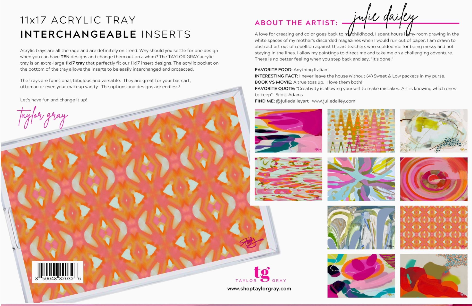 VOL 2 All Year Long is the insert set that is the gift that keeps giving. The set includes TWELVE inserts...a special design has been chosen to represent each month. Celebrating each month, each season and having the ability to change out the inserts allows this set to be in use 365 days a year! **Acrylic trays are all the rage and are definitely on trend. Why should customers settle for one design when they can have TEN designs and change them out on a whim? The TAYLOR GRAY acrylic tray is an extra-large 11x17 tray that perfectly fit our 11x17 insert designs. The patent pending pocket on the bottom of the tray allows the inserts to be easily interchanged and protected. The acrylic is also food safe. The trays are functional, fabulous and extra-large. They are great for your bar cart, ottoman or even for makeup on your vanity. The options and designs are endless!
