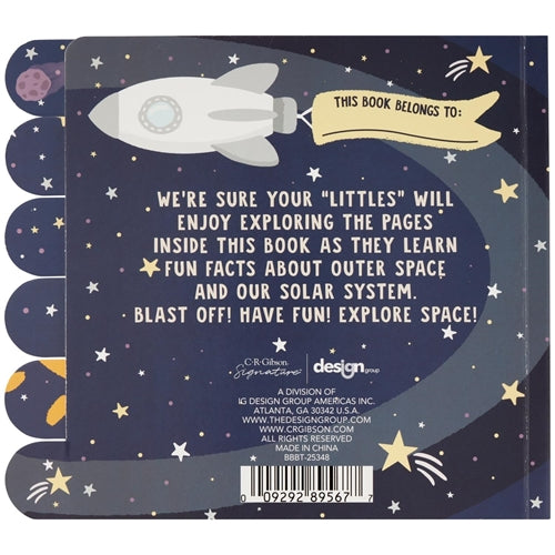 Let's Explore with our new Outer Space tabbed board book. Children can learn fun facts about outer space and our solar system throughout the 6 tabbed pages. CRGibson Signature original illustrations and story.