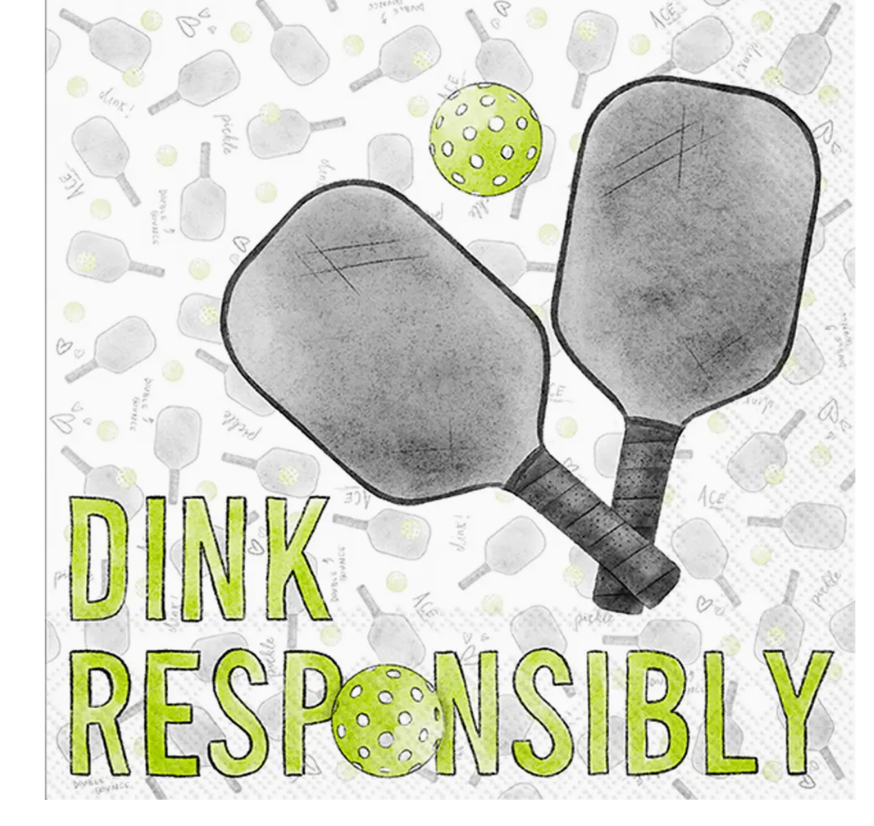 Description - Paper Cocktail Napkin Pack of 20 Dink Responsibly, Pickleball, Misc Information - 20 per pkg: 3 ply - 5 x 5 in., Country of origin - Germany, Materials - PAPER,