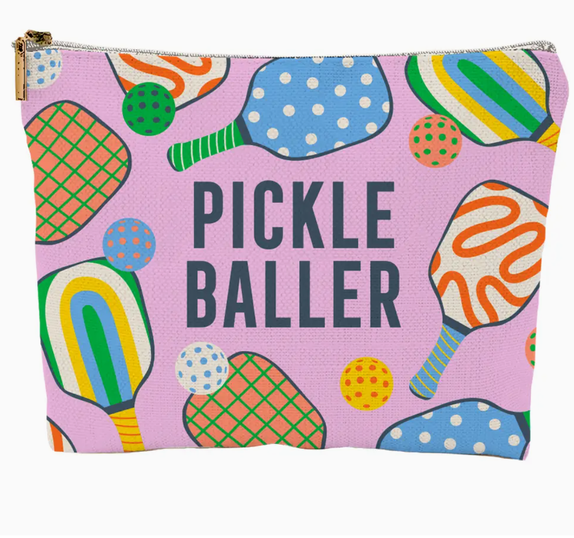 Pickle Baller Zip Pouch Our high quality canvas zip pouch is the perfect pouch for any pickle ball player to store all of makeup and/or travel necessities or any loose items. A perfect gift for any pickle ball lover in your midst. 8.75" x 6.75" canvas pouch with pom pom