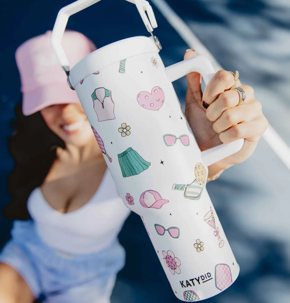 Match point! The Pickleball Tumbler by Katydid will be your boutique’s newest bestseller! This travel tumbler is perfect for customers with a sporty, active lifestyle. It features adorable pickleball paddles, martinis, and retro florals in trendy pastel pinks and greens. The side and top handles were designed with their active lifestyle in mind. From quickly grabbing a drink in between sets to holding with all of their game gear, this tumbler has a handle for it all! Pickleball is the newest hottest sport for all ages; your customers will love this preppy, stylish, and practical piece. Get ready to watch it fly off the shelves! 38 ounces includes reusable plastic straw all-day chill or heat stainless steel interior dishwasher safe screw-on plastic top with straw opening adjustable straw cover for easy travel easy-to-hold handle fits in car cup holder (3” diameter at base)