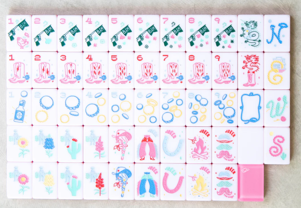 Boots, bottle caps, and toy guns represent cracks, dots, and bams. Cowboys perched against a fence post decorate the background of the flowers, and lassos spell out the winds.