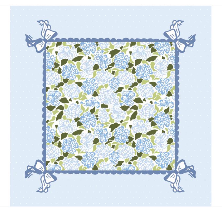 The Hydrangea Mat is a soft, feminine pairing for your Miss Darling Mahjong Tile Set, featuring a hand-drawn scalloped border, subtle polka dot detailing around the edge, and a watercolor-style hydrangea bloom at center.