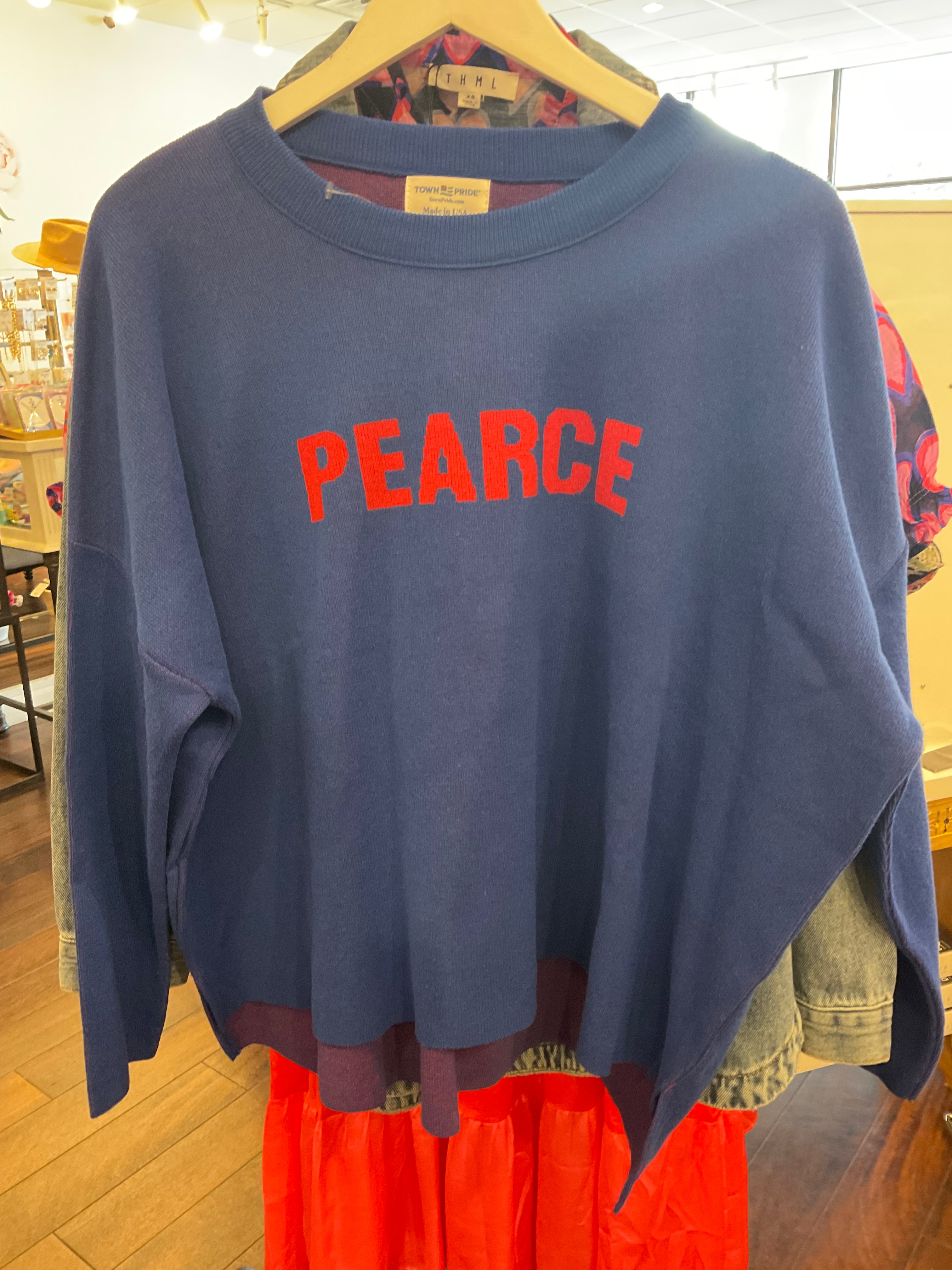 Lightweight royal blue crewneck with red block letters spelling Pearce