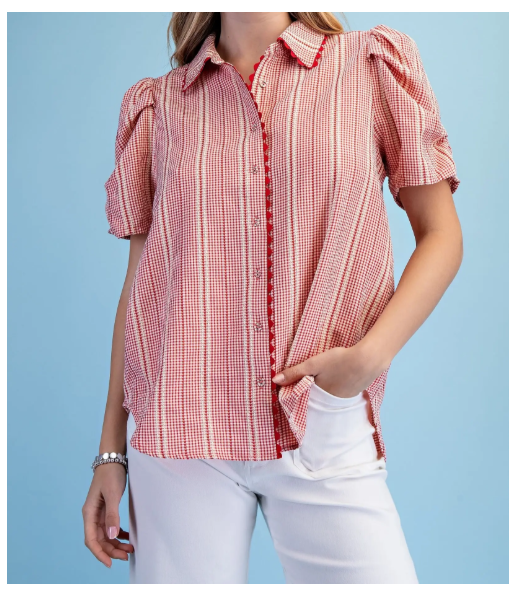 Embroidered Gingham Button Down with a Ric-Rac Trim and Gathered Sleeves