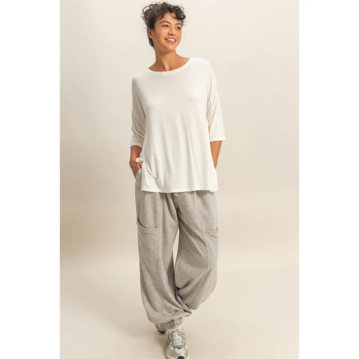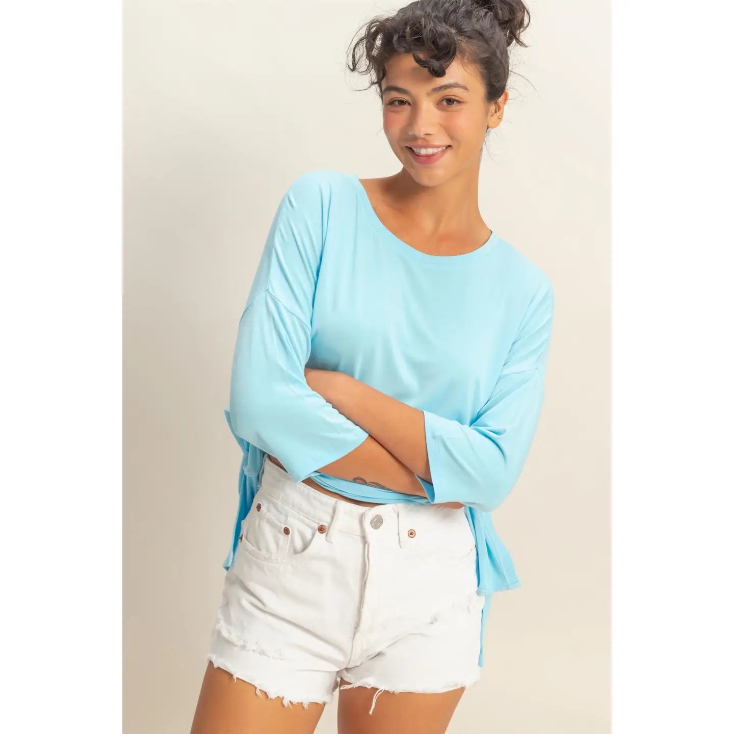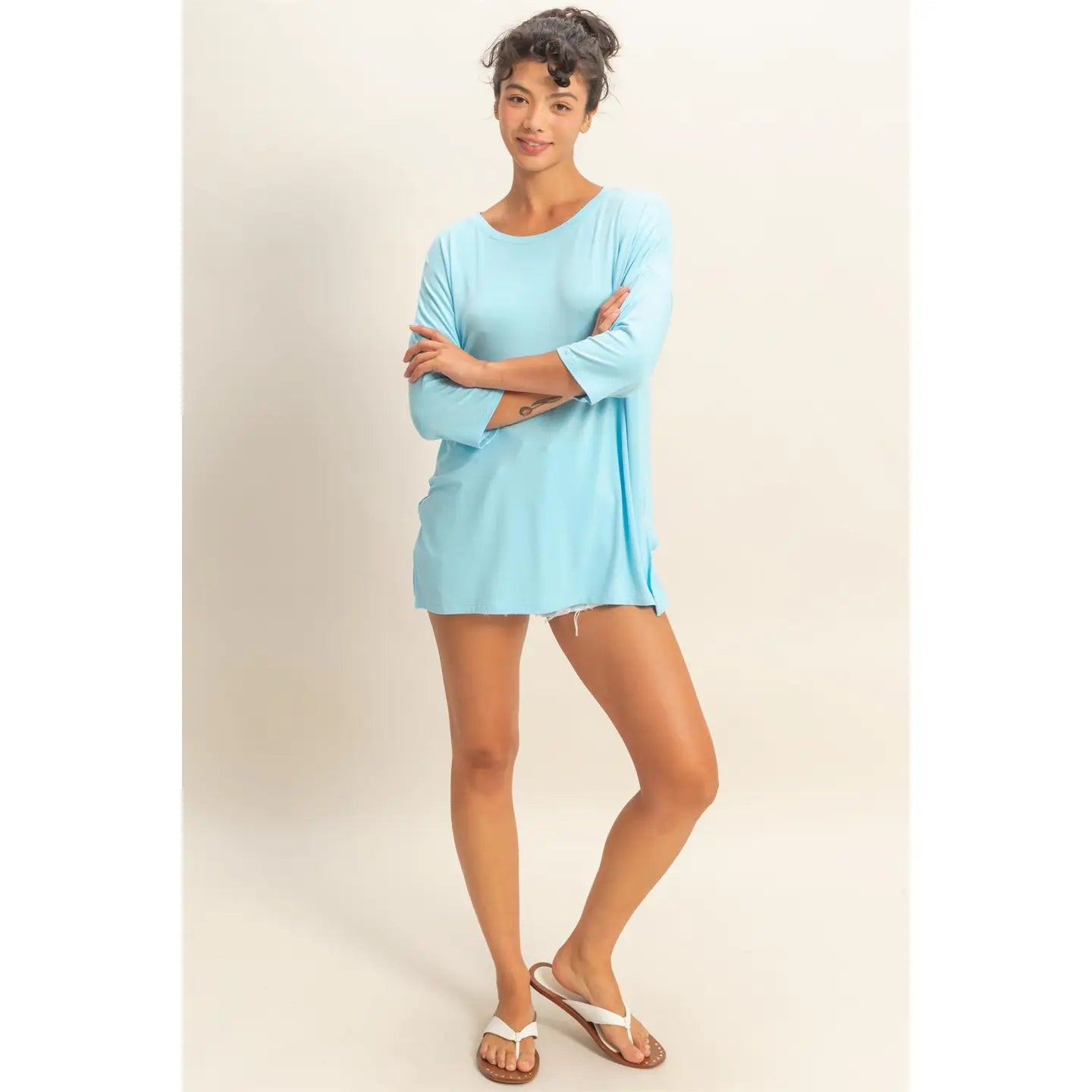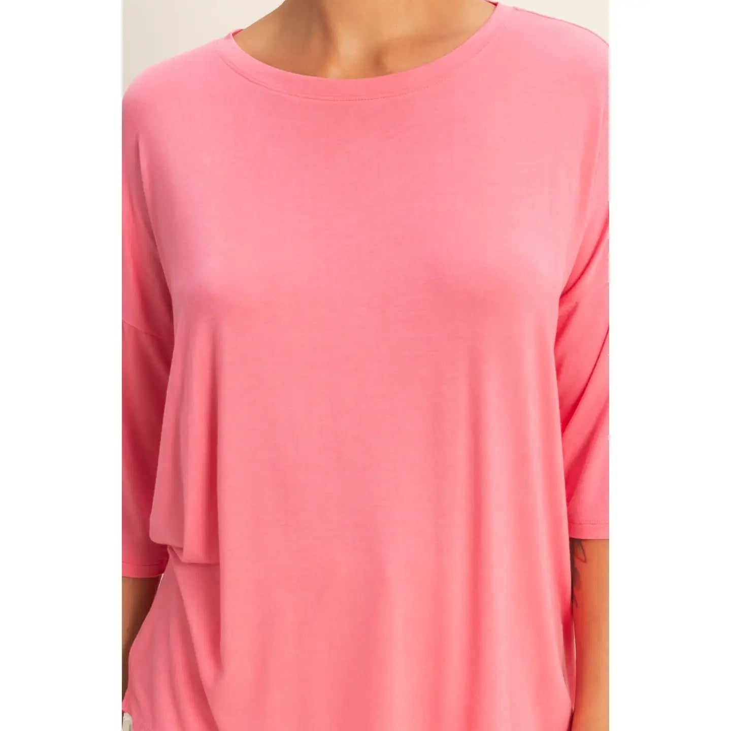 This top is crafted from a soft, fluid rayon-spandex jersey, featuring a gentle round neckline and three-quarter dolman sleeves with an extended drop shoulder. Cut in a relaxed, flowy fit, it has a tunic-style hemline and subtle high side slits for ease. Pair this piece with denim shorts and sandals for a casual day out. 95% Rayon 5% Spandex Model Is 5' 7" Tall, 32" Chest, 25" Waist, 36" Hips And Wearing A Size Small