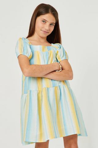 Textured Vertical Stripe Puff Sleeve Tiered Dress