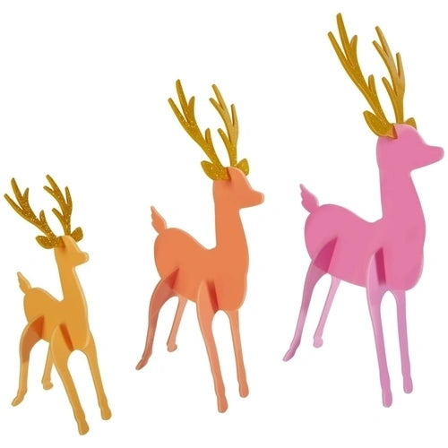 Bright colorful acrylic Christmas Deer. Set includes 3 deer in large medium and small sizes. Three different colorway sets with available, deer come with gold glitter acrylic antlers. Collect them all to build the Rainbow. Some assembly required. Gift Boxed
