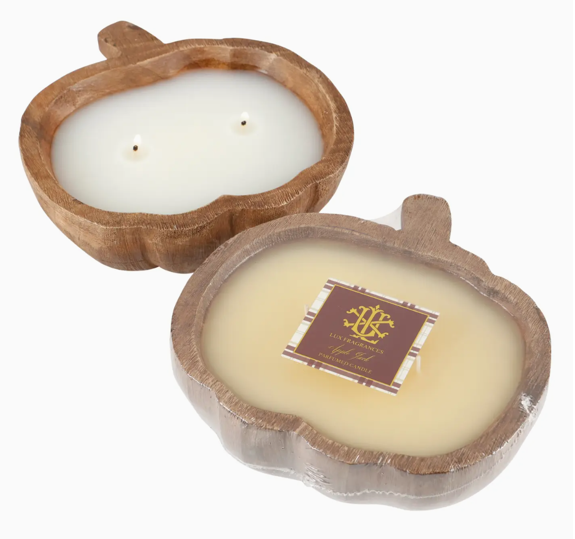 Apple Jack - The fragrance of golden delicious apples, cinnamon and cider Indulge in the warm and inviting scent of golden delicious apples, cinnamon, and cider with our Apple Jack 2 Wick Pumpkin Dough Bowl Candle-Small. The wooden pumpkin bowl adds a touch of rustic charm while the two wicks ensure a long-lasting burn. Perfect for creating a cozy and comforting atmosphere in any room.