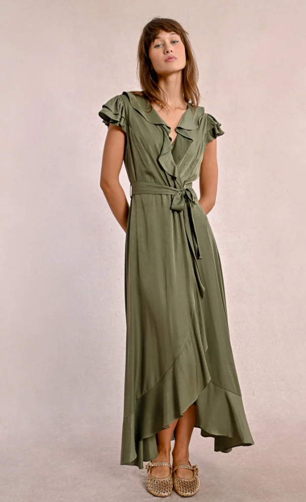 -Long dress, short sleeves-Ruffled collar and sleeves-Asymmetry at the bottom of the dress-Tieable at the waist, V-neck