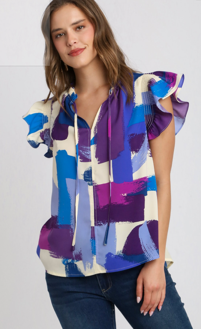 Blush Stroke Print Boxy Cut V-Neck Top with Flutter Sleeves