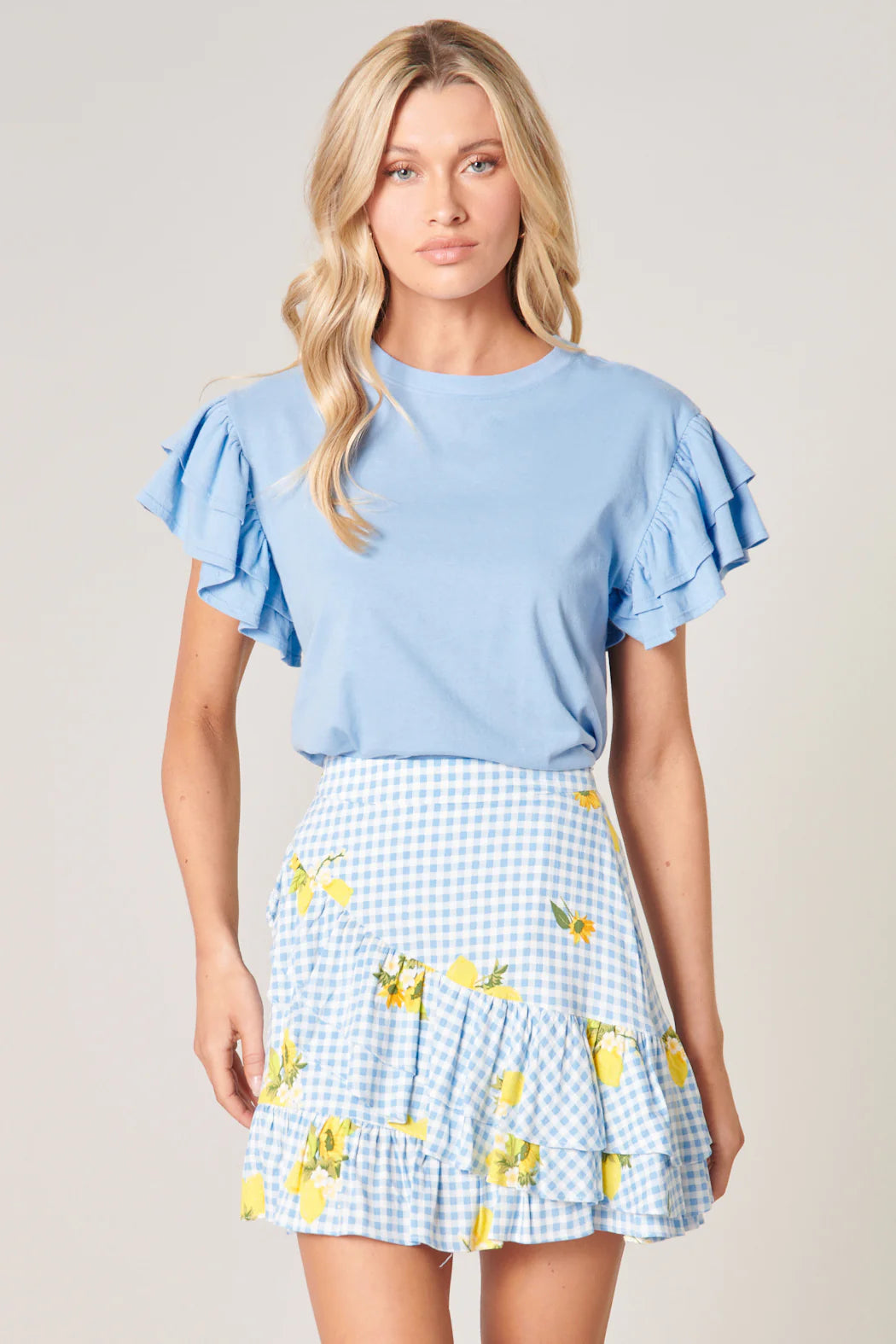 The classic cotton tee gets an upgrade featuring an extended shoulder with ruffle layer short sleeves. The bodice maintains a classic slim fit and can be paired with bottoms of choice and platform sneakers for a trendy look.