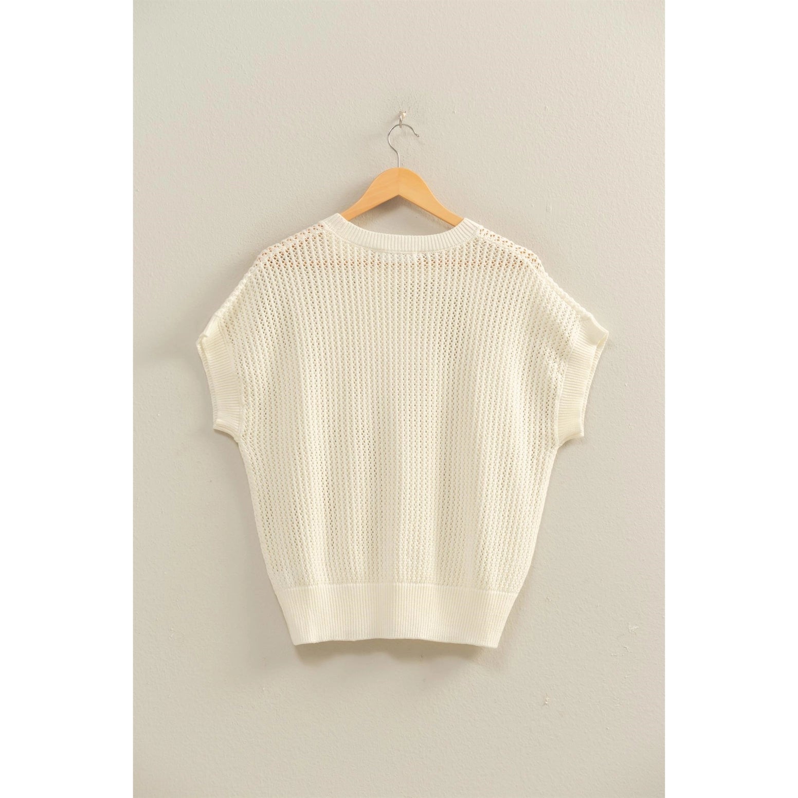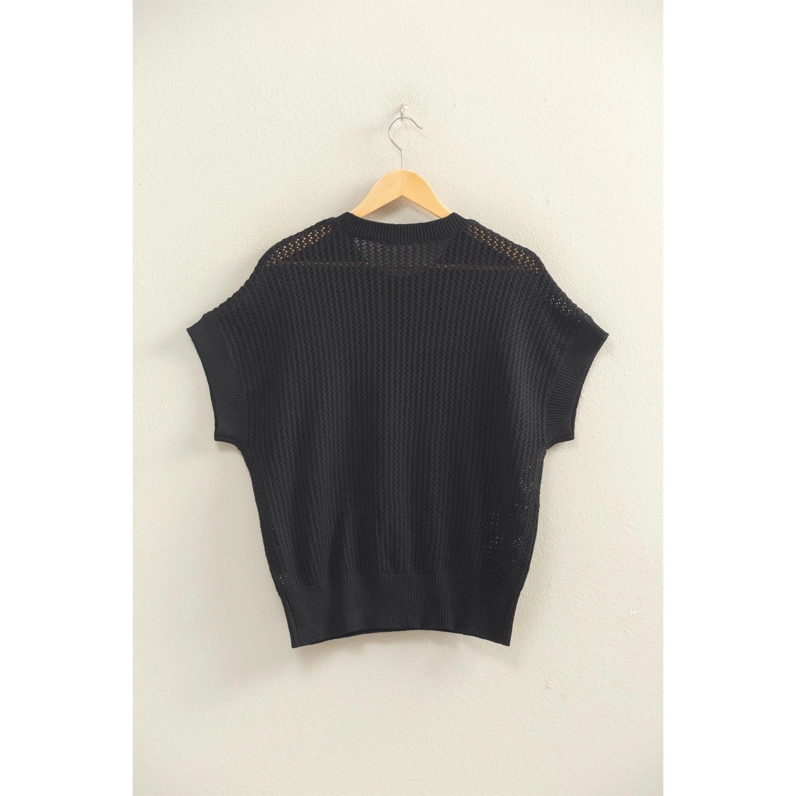 Look cool under the sun wearing this top that features an open-knit construction to keep it feeling breezy. It has a crew neck, batwing-inspired short sleeves and a relaxed fit that can be worn solo or layered over a tank top. 55% Cotton 45% Acrylic Model Is 5' 7" Tall, 32" Chest, 25" Waist, 36" Hips And Wearing A Size Small