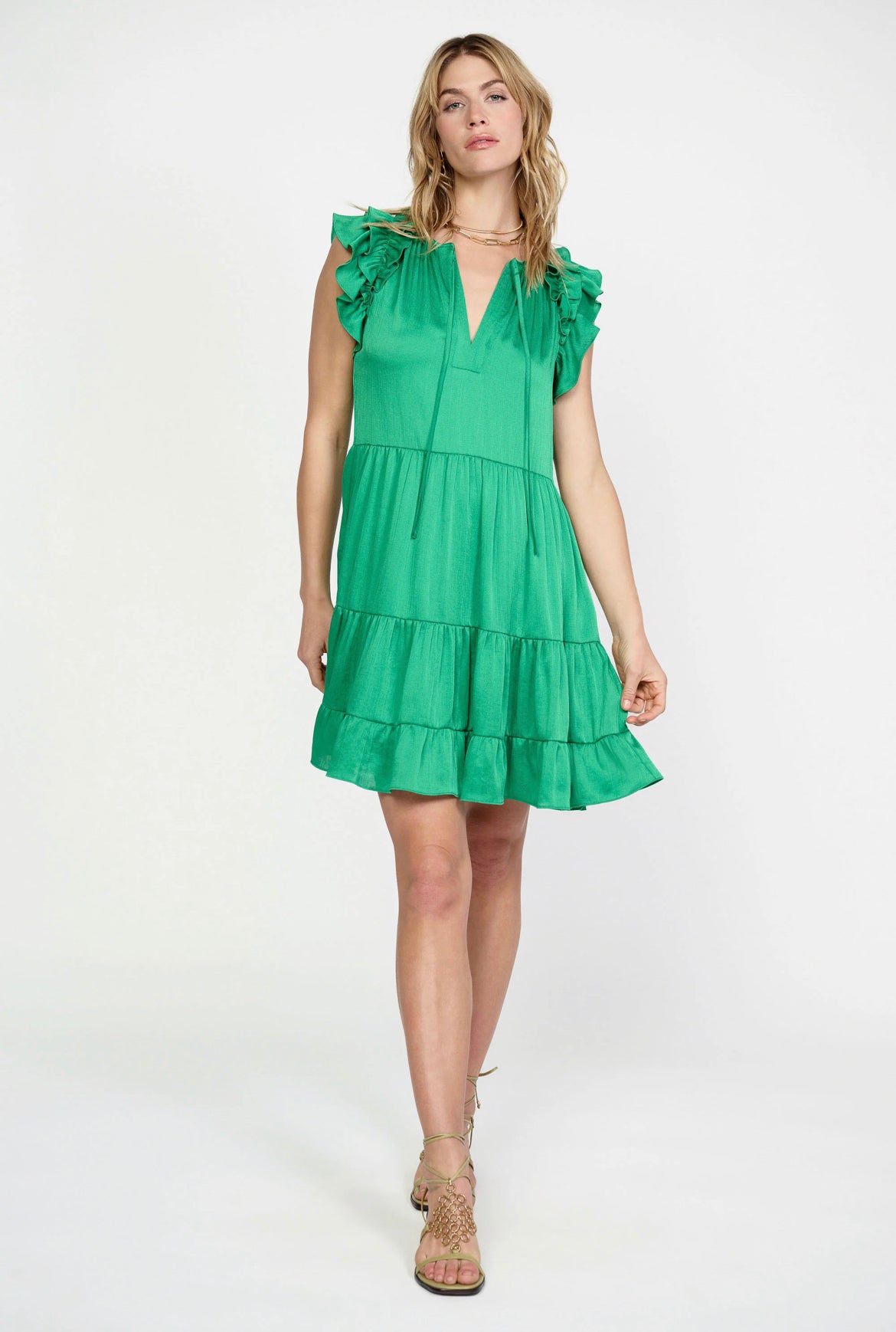 Perfect for dancing and celebratory occasions, this lustrous tiered mini dress catches the eye in a striking emerald green shade. It's got a relaxed shape with a split neckline, tie detailing, and little flutter sleeves encircled by ruffles.