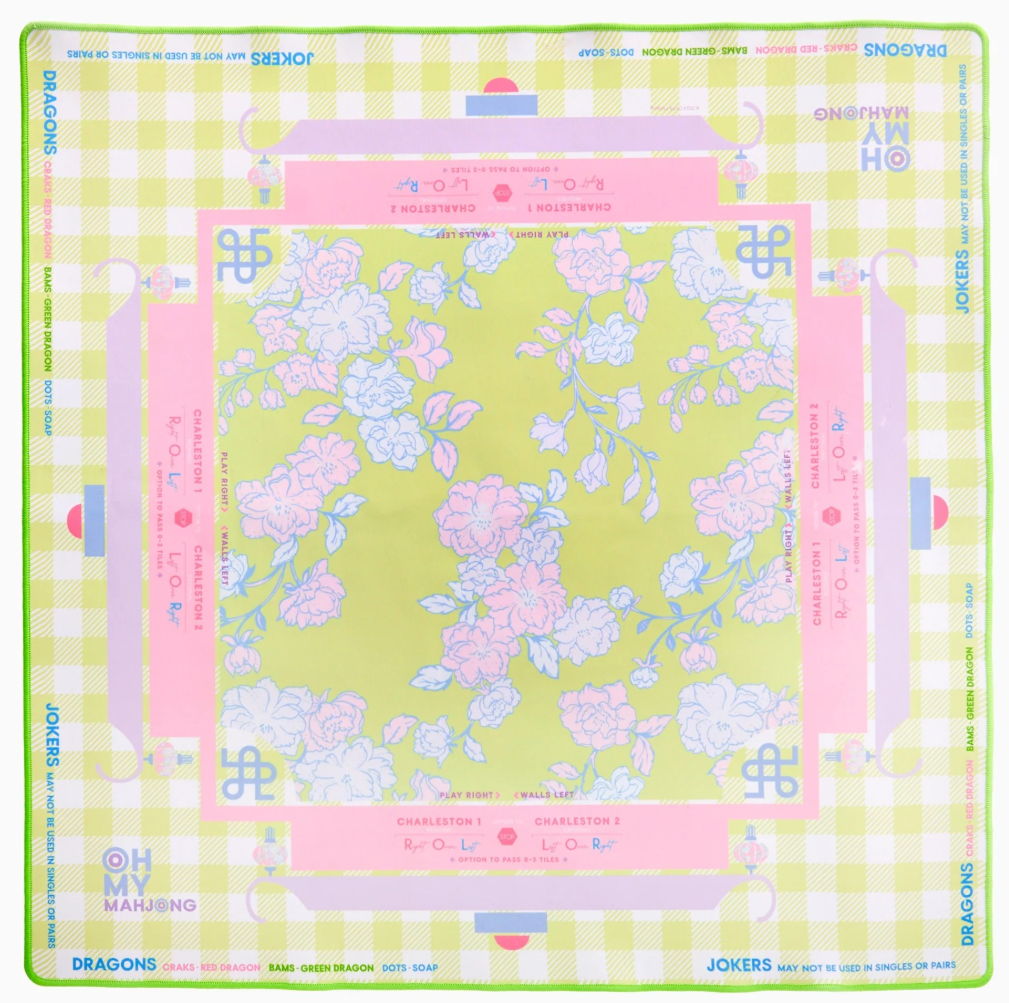 Introducing the Garden Party Mahjong Mat—a delightful combination of vibrant pastel hues and enchanting florals, intertwined with a charming green gingham pattern. This neoprene mat features a non-slip bottom to ensure your tiles stay perfectly in place, game after game. Adorned with delicate blossoms and inviting colors, it exudes a frilly femininity that is both elegant and playful. Along the sides of the mat, you’ll find the signature Oh My Mahjong instructional reminders, guiding you through each round.