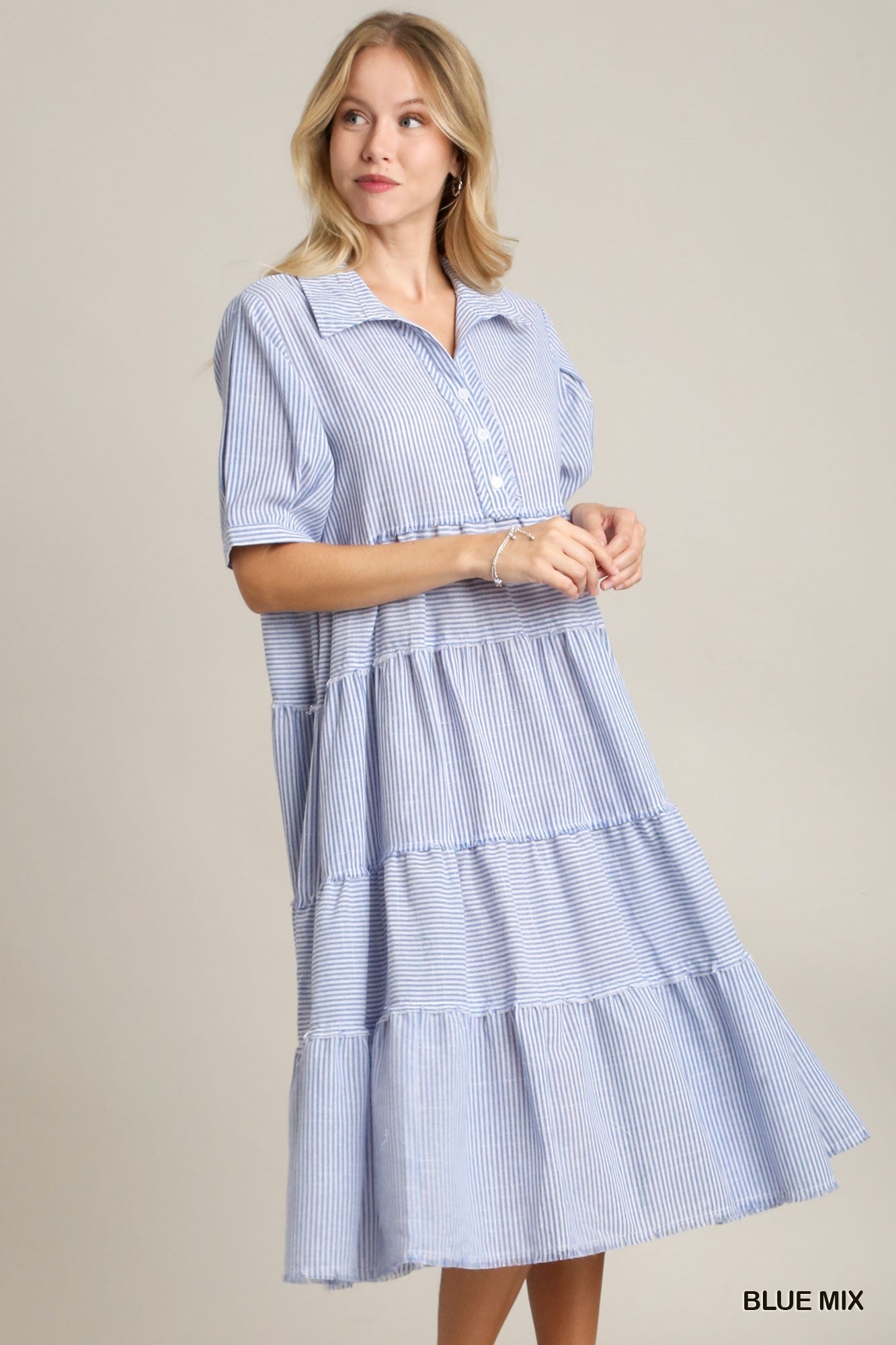 Stripe Tiered A-Line Maxi Dress with Short Balloon Sleeve & Fray Details