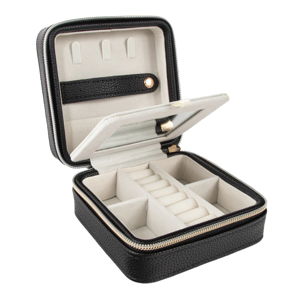 This square zippered case will solve all your jewelry transport problems. Made of a durable and flexible vegan material with a soft linen lining, it features multiple layers to hold earrings, bracelets, necklaces and other jewels, keeping them safe and contained while traveling.