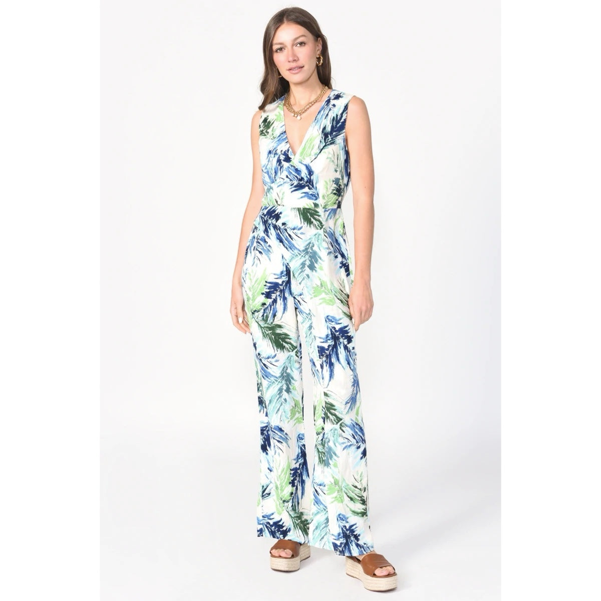 Printed sleeveless V neck jumpsuit with extra overlap layer at front.