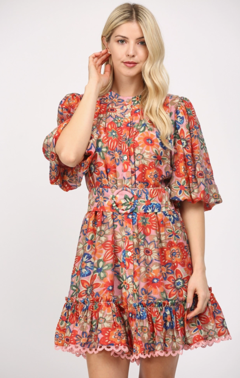 Crochet lace trimmed puff slv dress / belt S:75%rayon 25%nylon / l:100%cotton