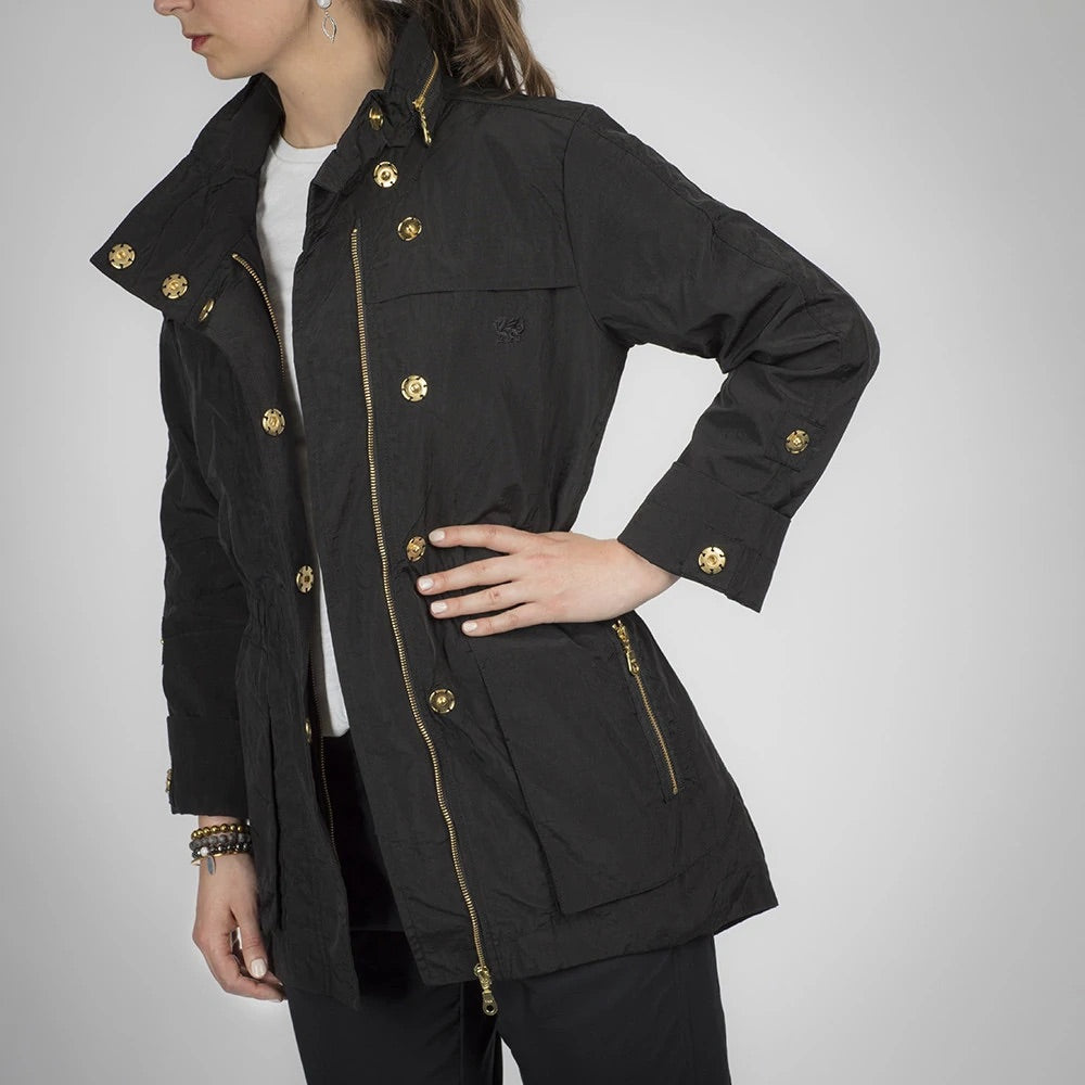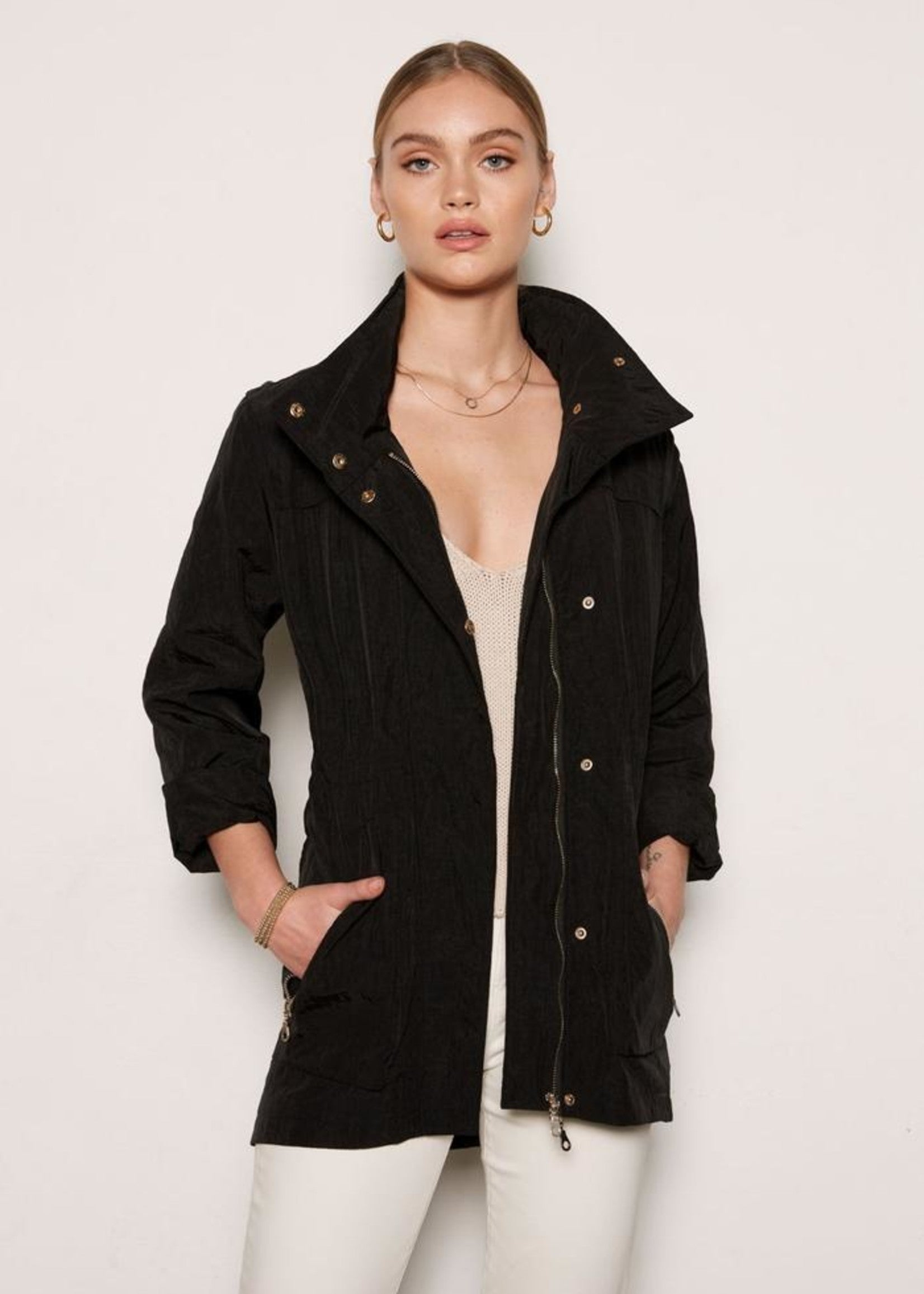 Fashion meets function with the Cory Jacket. A subtle high-low silhouette and high collared water-resistant jacket finished with deep pockets for convenience. Optional hood and optional cuffed fastened sleeves.
