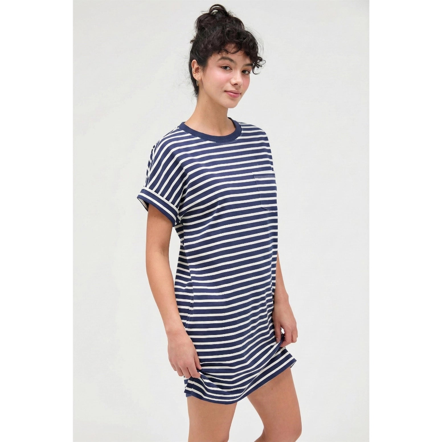 This effortlessly stylish mini dress is a wardrobe staple. Offering the ease and style of a T shirt in the form of a mini dress, it is styled with a classic crew neck, chest pocket and a casual fit. Cuffed short sleeves underscore the relaxed look. 100% Cotton Model Is 5' 7" Tall, 32" Chest, 25" Waist, 36" Hips And Wearing A Size Small
