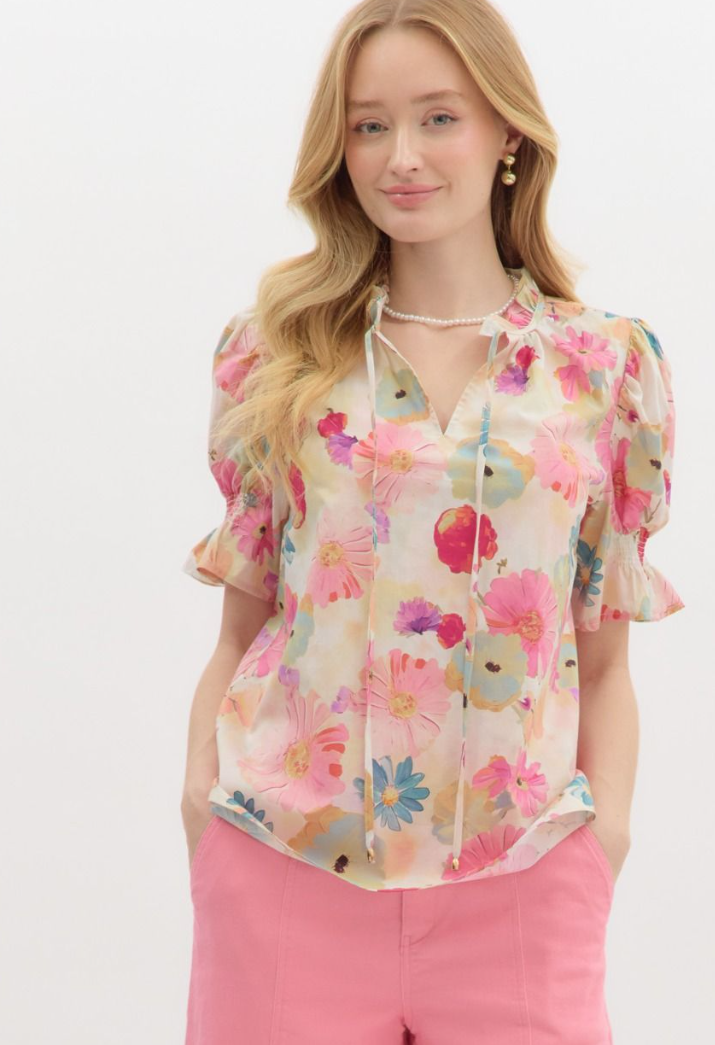 Floral print smocked short sleeve pullover top featuring ruffle accented split neck tie closure. Unlined. Woven. Non-sheer. Lightweight.
