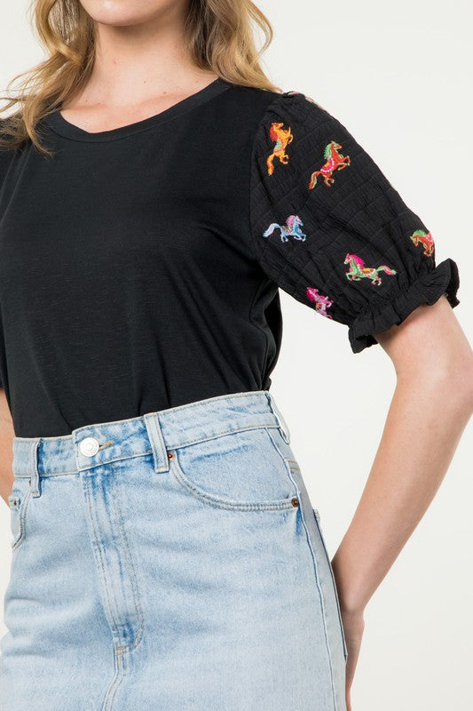 Cute Top with Embroidered Horses on the Sleeves 95% Polyester