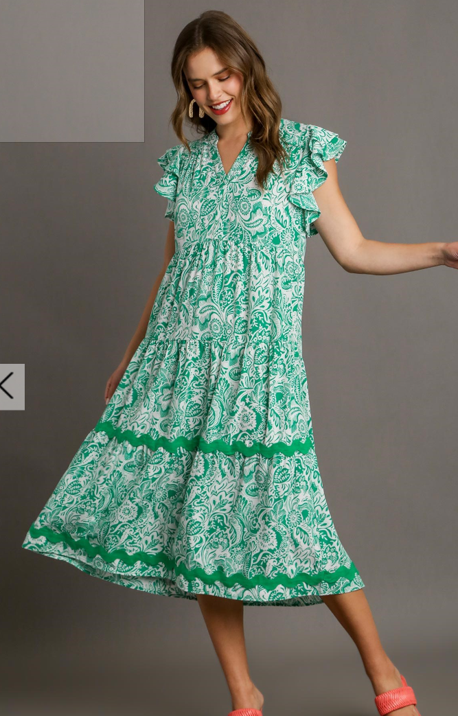 Two Tone Floral Print Tiered Midi Dress with Ric Rac Trim Fabric Contents:• 100% Polyester
