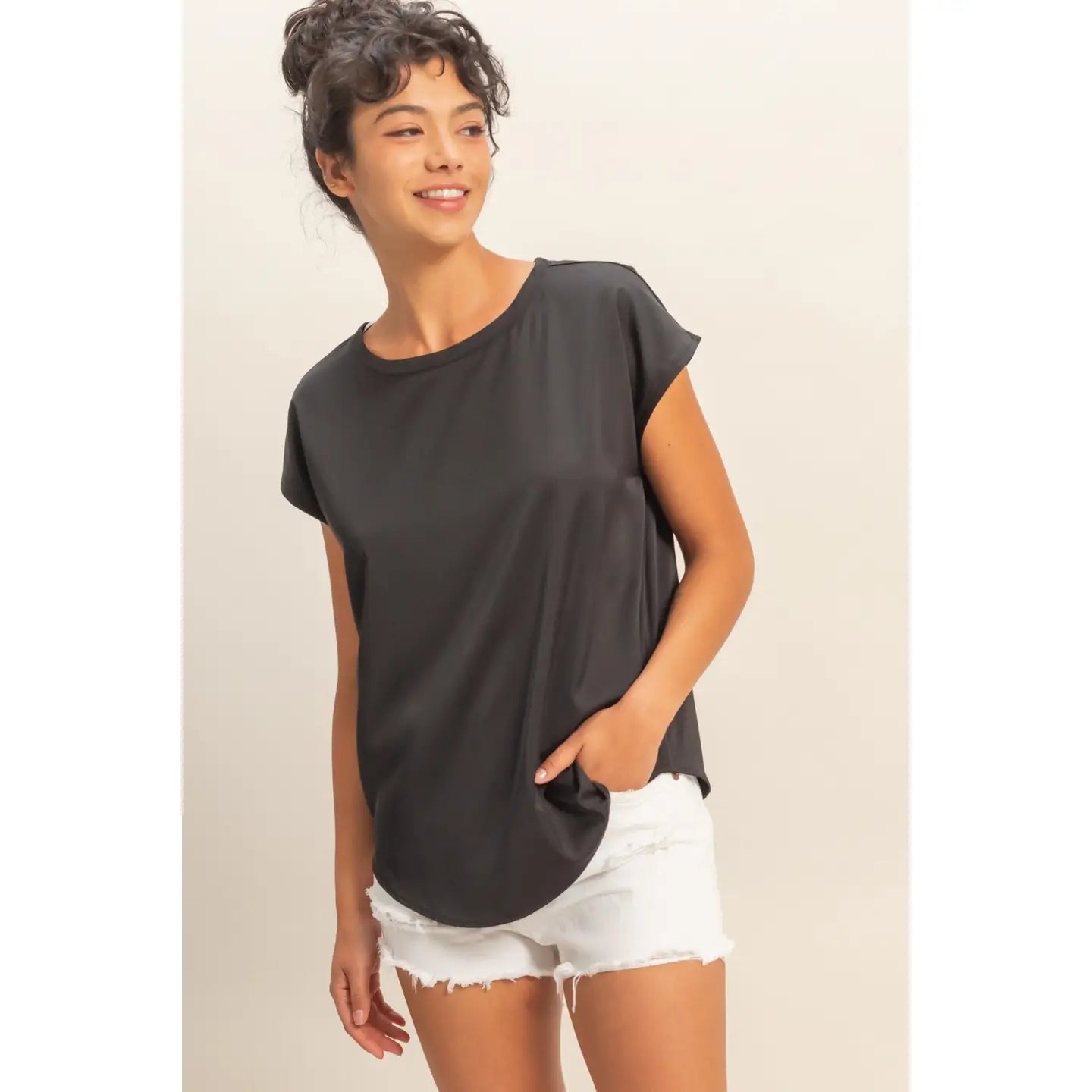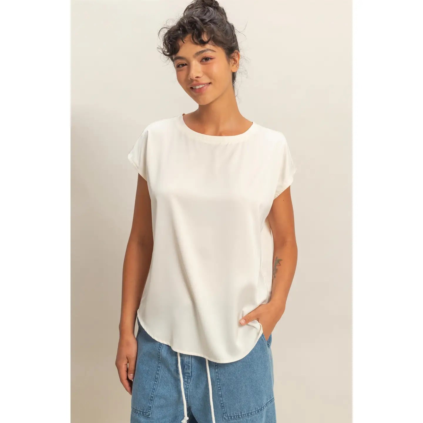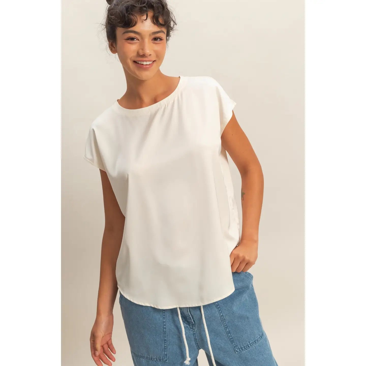Exude ease in this lustrous satin blouse, featuring short dolman sleeves that drape seamlessly from the shoulder. The smooth round neckline adds a classic, clean finish. Cut in a generous oversized fit, it falls to a gentle curved hem. Pair with tailored shorts for a sophisticated casual ensemble. Model Is 5' 7" Tall, 32" Chest, 25" Waist, 36" Hips And Wearing A Size Small