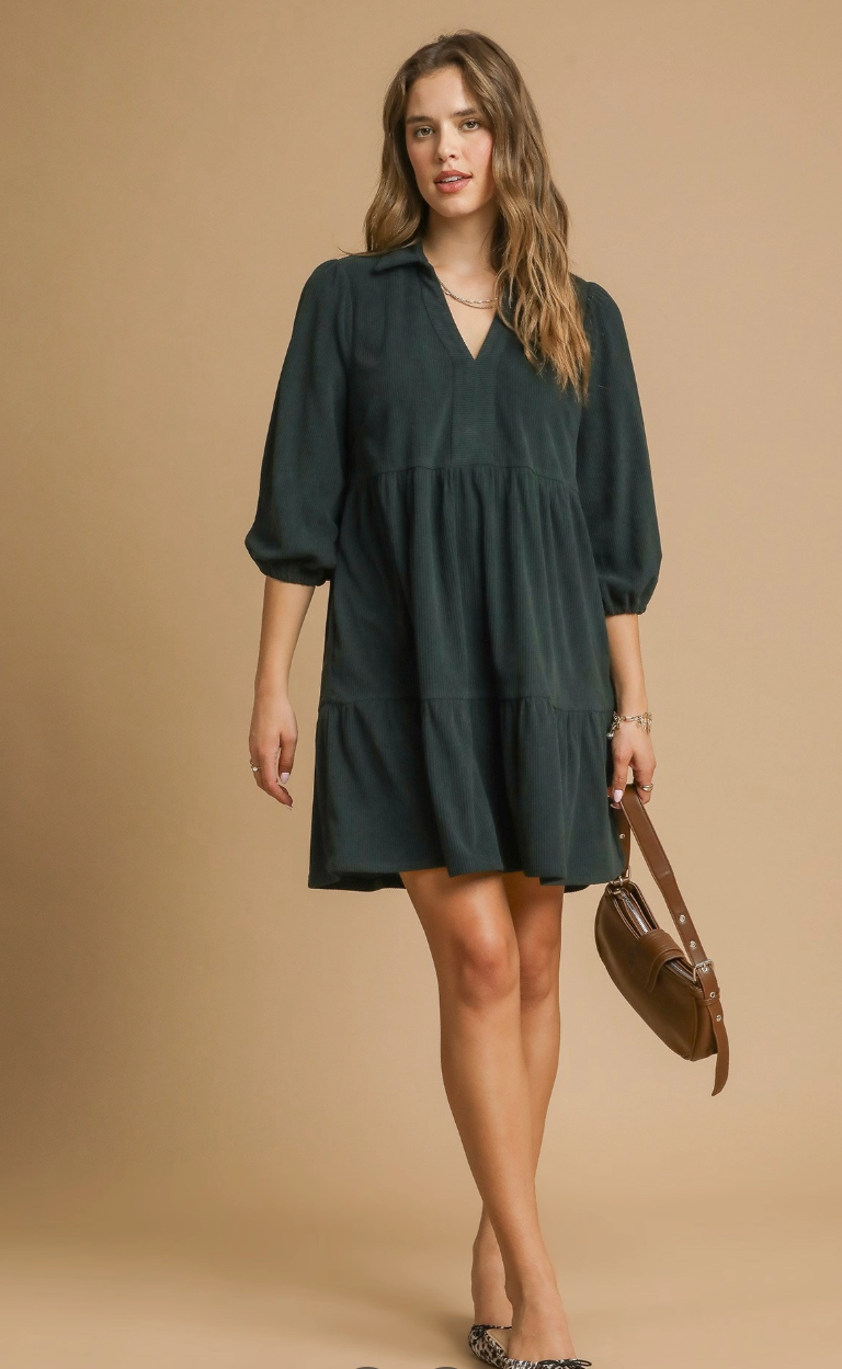 Tiered Corduroy Mini Dress with Balloon Sleeves