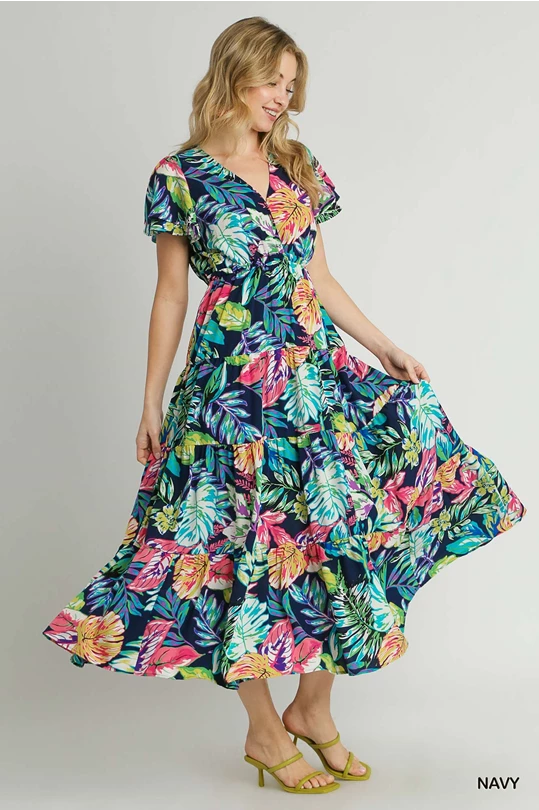 Floral Mixed Print V-Neck Midi A-Line Dress with Short Sleeve